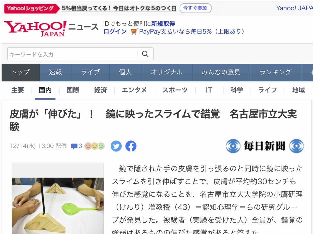 2022.11|スライムハンド錯覚に関する論文が出版され、各種のメディアで紹介されています。