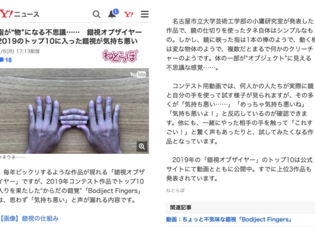 『Best Illusion of the Year Contest 2019』のTop10にノミネートされた「Bodiject Fingers」に関する記事が出ました。 (ねとらぼ):指が“物”になる不思議…… 錯視オブザイヤー2019のトップ10に入った錯視が気持ち悪い なお、コンテスト用の動画は202...