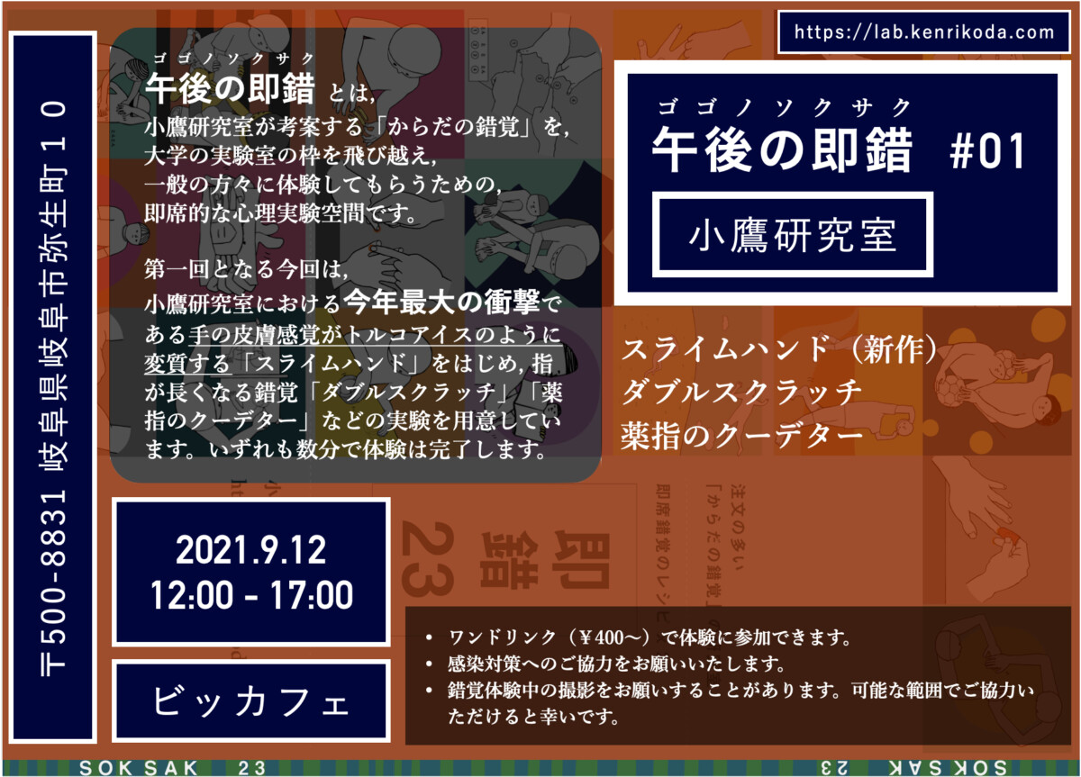 09Sep2021 午後の即錯 #01(2021.9.12) DATE 2021.9.12 LOCATION ビッカフェ(〒500-8831 岐阜県岐阜市弥生町10) FLAYER [PDF] WORK スライムハンド(新作) ダブルスクラッチ [WORK] 薬指のクーデター [WORK] Tweet Share Hatena Pocket RSS feedly Pin it
