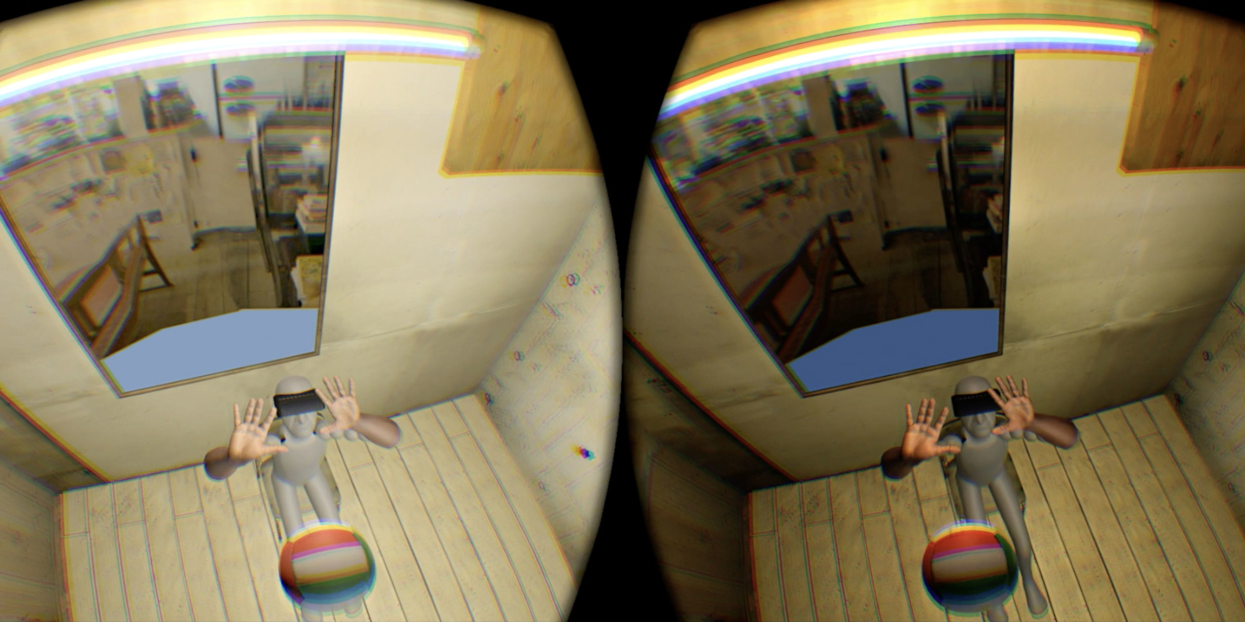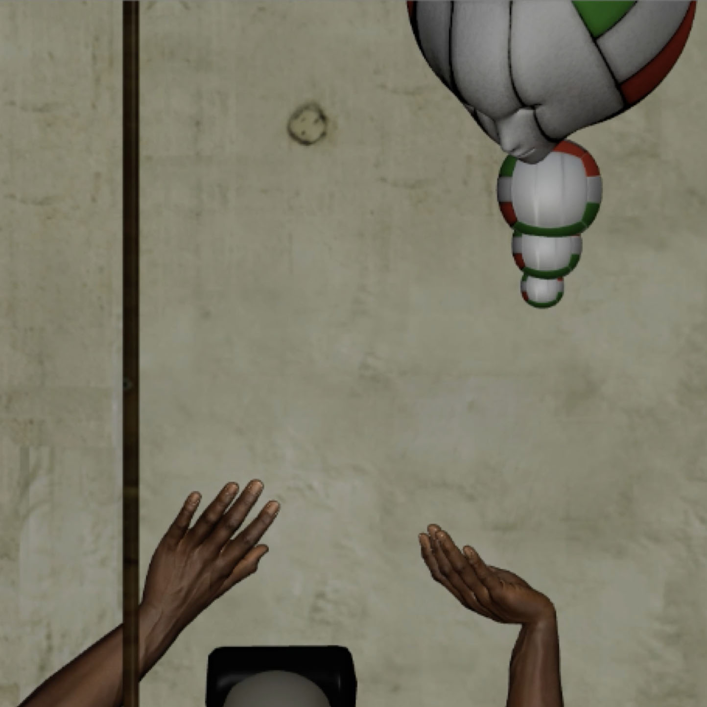 ◯ 「I am a volleyball tossed by my hands」では、一人称視点「(アバターが)バレーボールをトスする」から三人称視点「(バレーボールが)アバターにトスされる」への切替に伴う残渣として、(事後的にであれ)アバターに対して「自分のいるべき特異的な場所」としての定位感が投影されるのではないかと考えた。このインタラクションを設計しているときに、三人称視点の視線の先は、常に「自分のあるべき場所」に収束されないといけない、という強い確信を得た。これは幽体離脱の体験者の多くが、特に強く意図しているわけでもなく、(気づけば)自分の身体に対して視線が投げかけられていることに対応している。つまり、自らの”生々しい身体”と遭遇するためには、二人称的な対面の流儀が要求されるであろう、ということ。