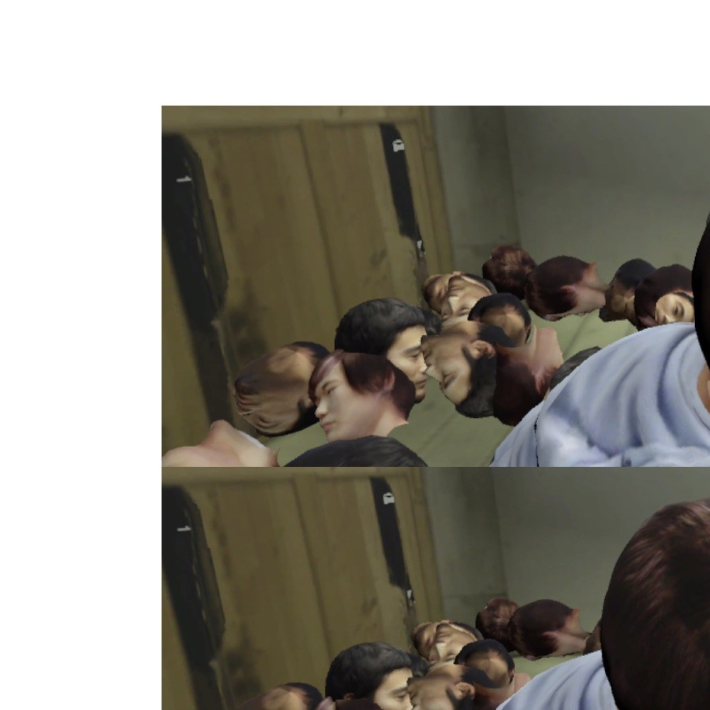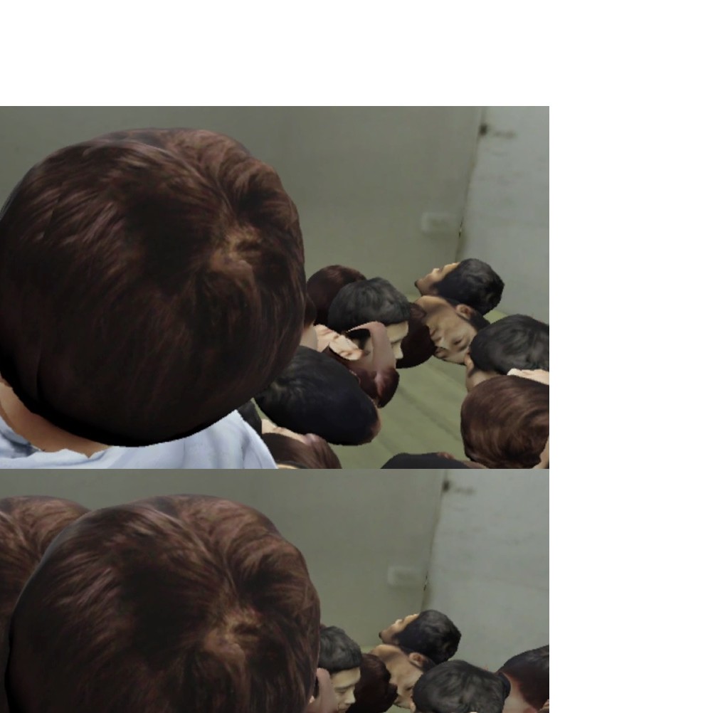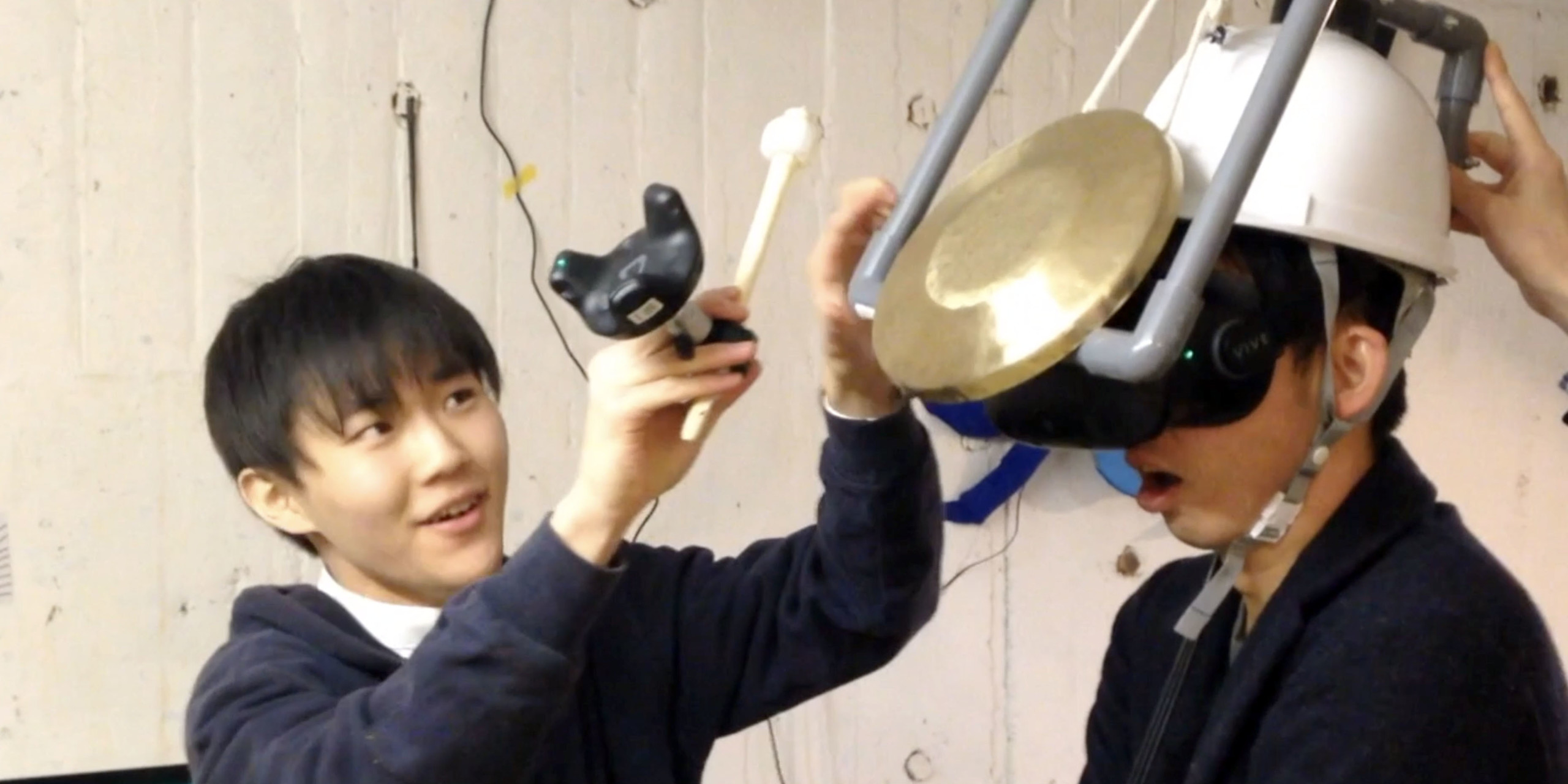 In the HMD system, the physical head rotation of the HMD wearer is always associated with the avatar’s head rotation that the wearer sees in a HMD space. This correlation is essential to convey an illusion: it is as though the HMD wearer owns the avatar’s head as his or her body; this is referred to as full body illusion (Salmon et al., 2013). The unrealistic separation is exhibited in two ways. The first separation occurs by a physical blow to the head; a head-size gong is hung before the HMD and an experimenter beats the gong directly and intensely with a drum-stick. The timing of the crash is detected through a built-in micro-phone of the VIVE (HTC). Once the crash is detected, the perspective, which is located just behind the avatar’s head, is blown off backwards from the original body. The second separation occurs by intentionally leaning the physical head backwards; the consequence is in contrast with the first separation. The perspective is slowly separated from the original head according to the inclination of the angle of the head toward the backward direction.