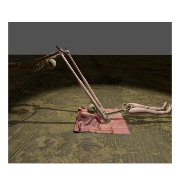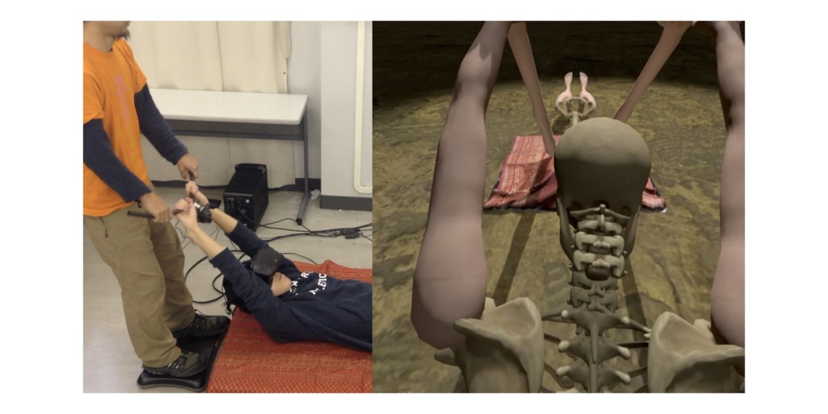 体験者は、仰向けに寝転がったまま両手でパイプを握ります。補助者の手によってパイプが引っ張り上げられるのと同時に、HMD上の視界はちょうど「大車輪」を行うようにぐるりと回転し、自身の寝転がった身体を見下ろす位置へと上がっていきます。この「大車輪」の角度は、Wii Boardによって計測された、補助者の体重増加量によって増減します。