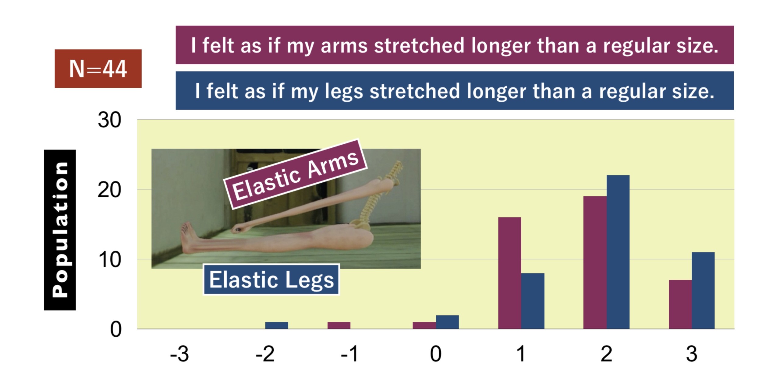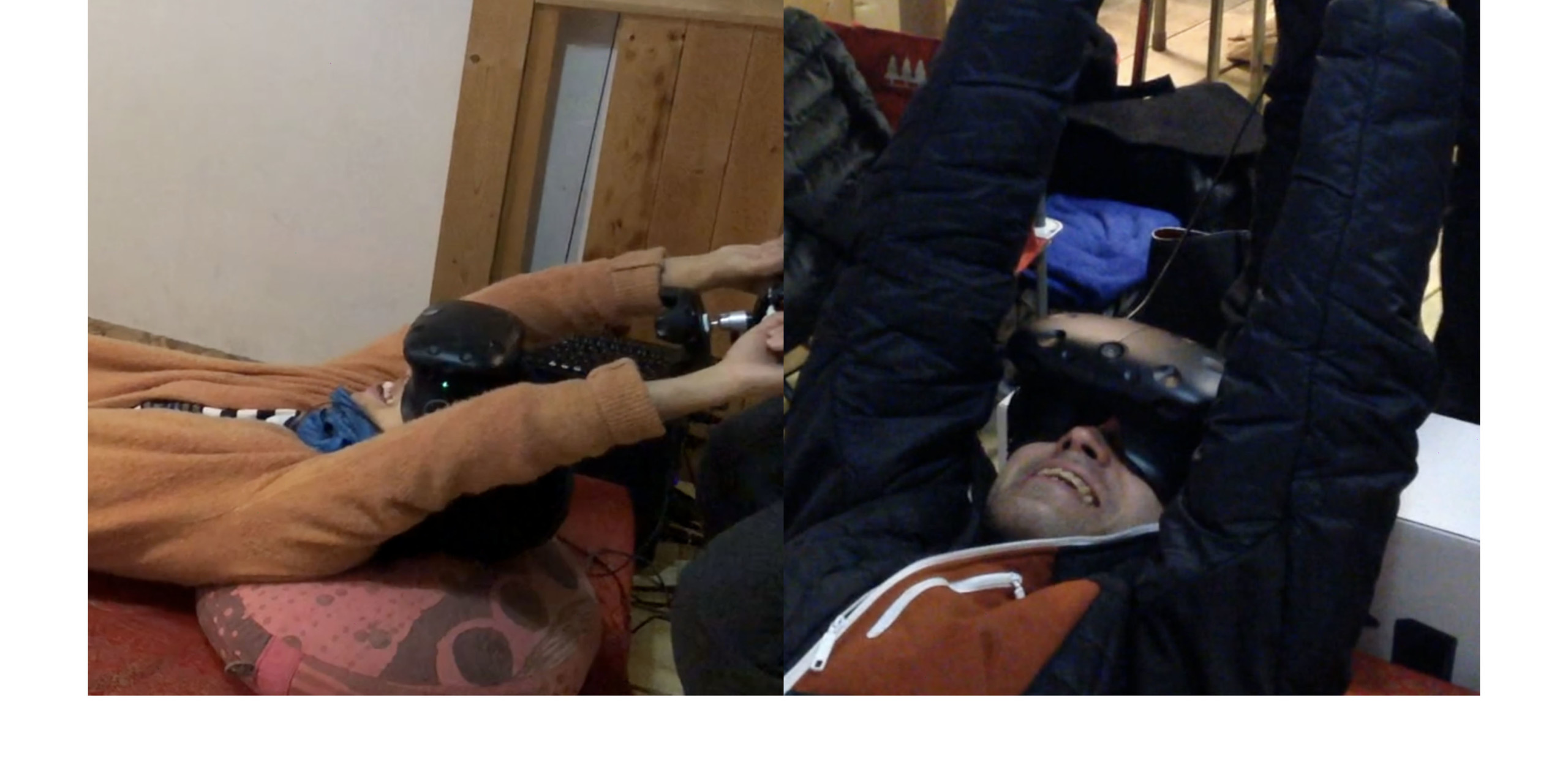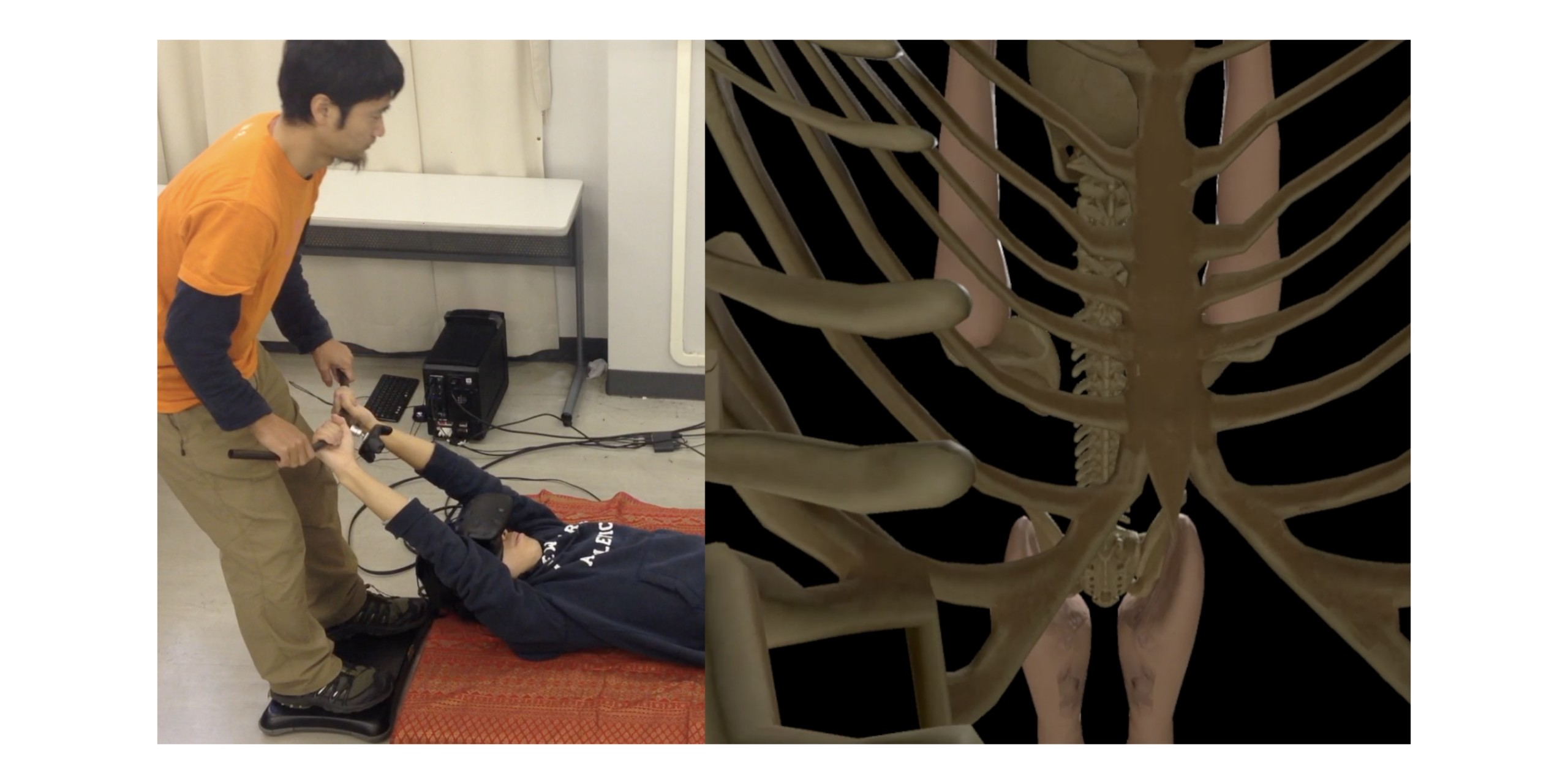 体験者は、仰向けに寝転がったまま両手でパイプを握ります。補助者の手によってパイプが引っ張り上げられるのと同時に、HMD上の視界はちょうど「大車輪」を行うようにぐるりと回転し、自身の寝転がった身体を見下ろす位置へと上がっていきます。この「大車輪」の角度は、Wii Boardによって計測された、補助者の体重増加量によって増減します。