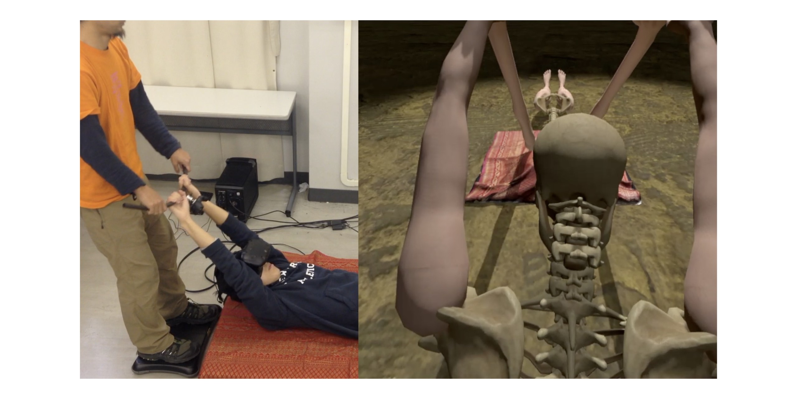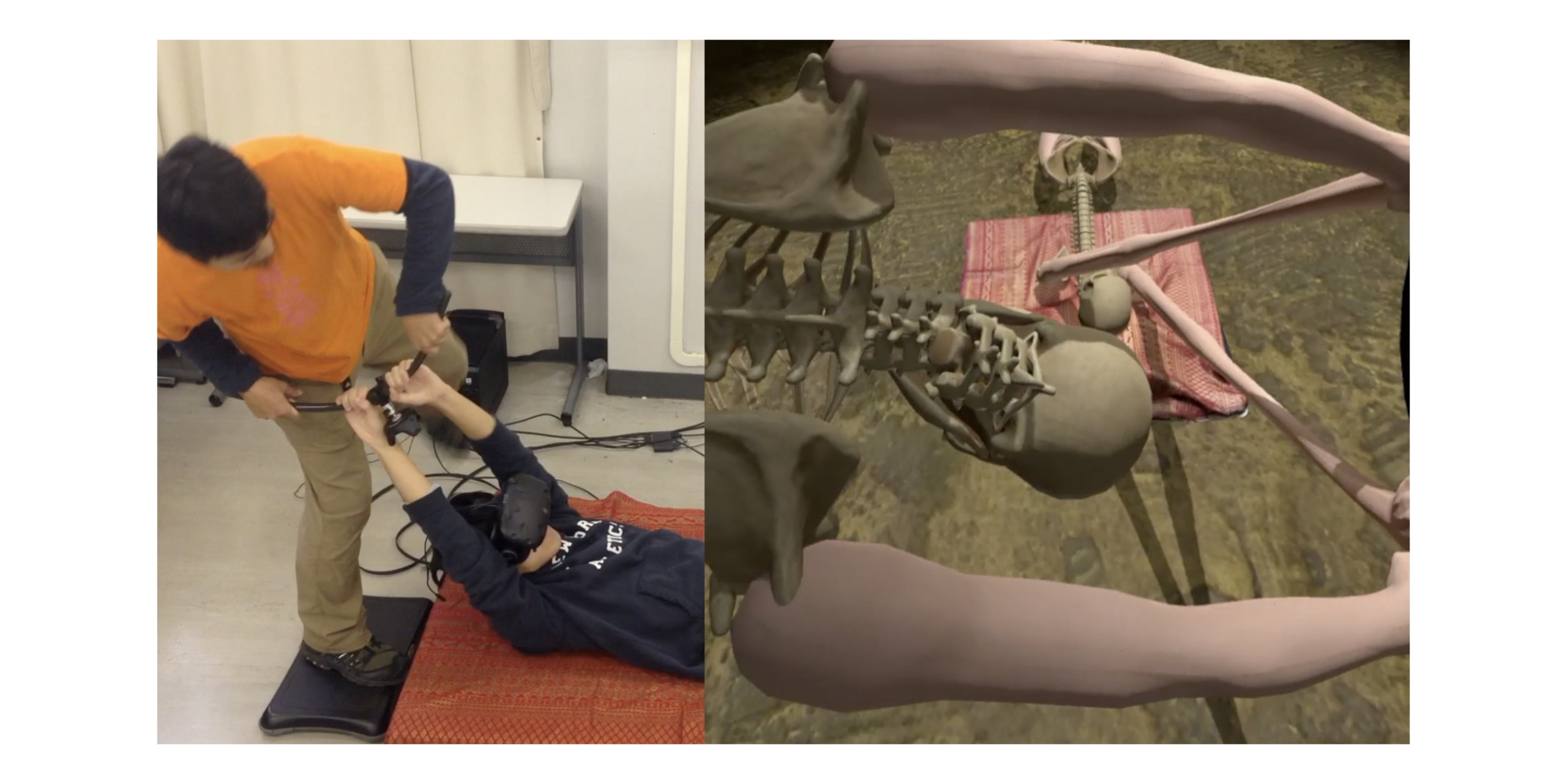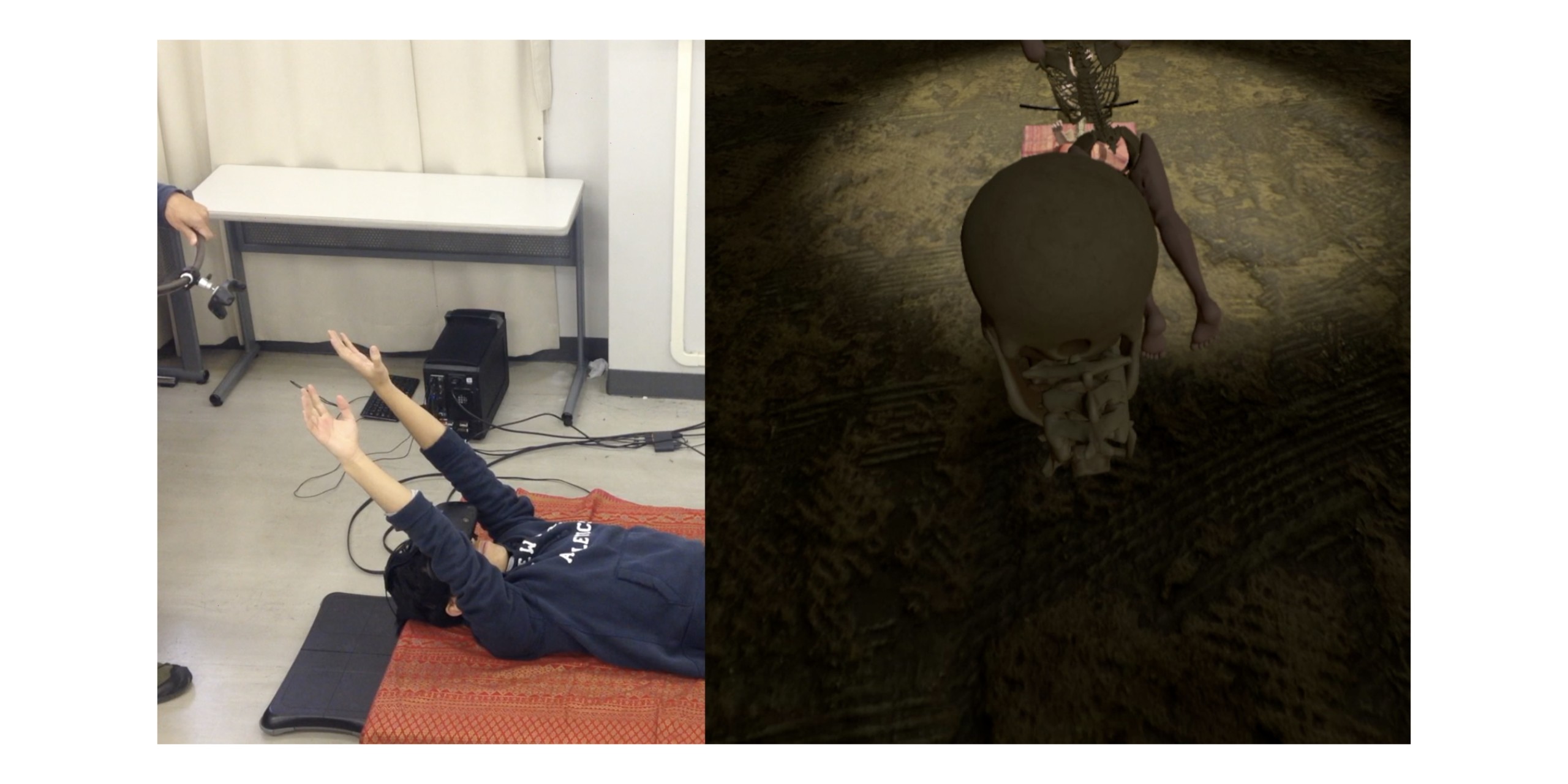 移動した視点において体験者は、自身が天井から床を見降ろしているかのような、重力方向の反転した錯覚を感じ、同時に、自分の腕を引っ張られながらにして自分が腕を引っ張る側に立っているような、受動と能動の反転する錯覚を誘発します。以上のような、「重力方向」および「受動と能動」、二つの反転した錯覚を内包するインタラクションを設計しました。
