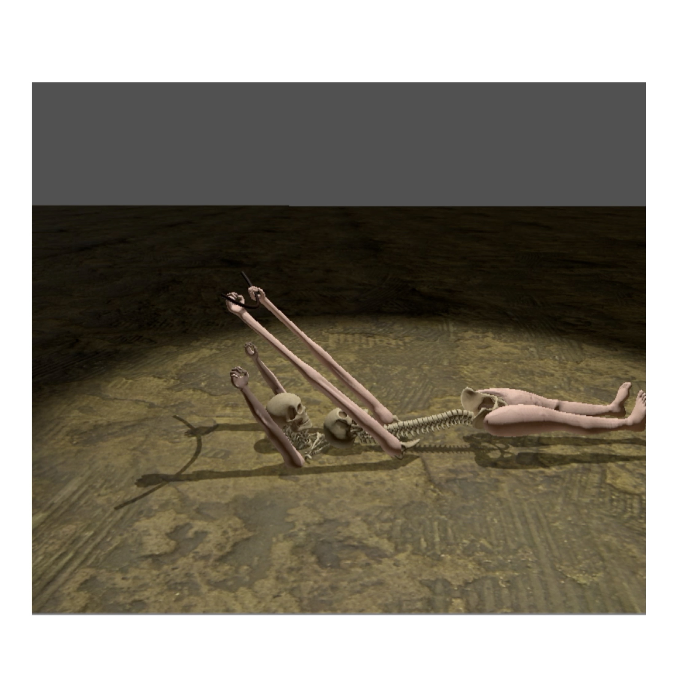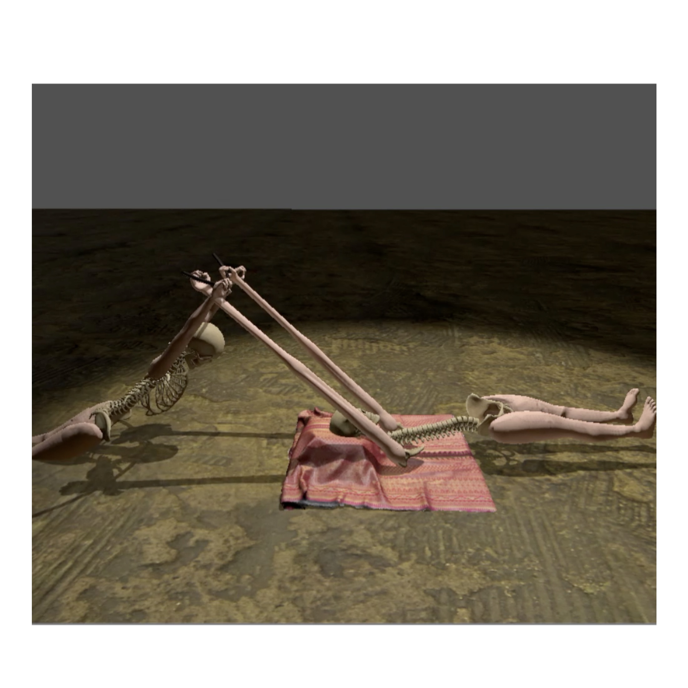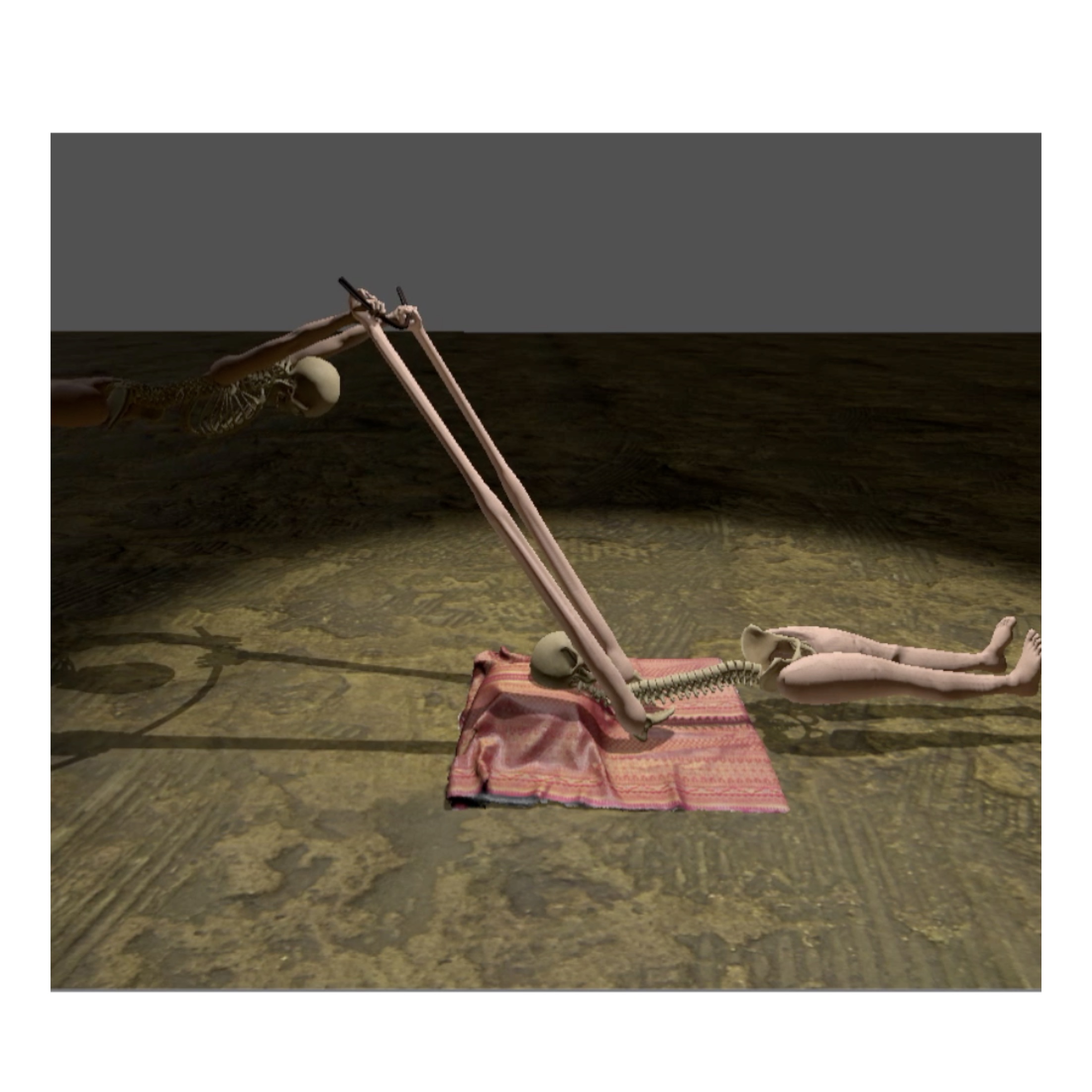 移動した視点において体験者は、自身が天井から床を見降ろしているかのような、重力方向の反転した錯覚を感じ、同時に、自分の腕を引っ張られながらにして自分が腕を引っ張る側に立っているような、受動と能動の反転する錯覚を誘発します。以上のような、「重力方向」および「受動と能動」、二つの反転した錯覚を内包するインタラクションを設計しました。