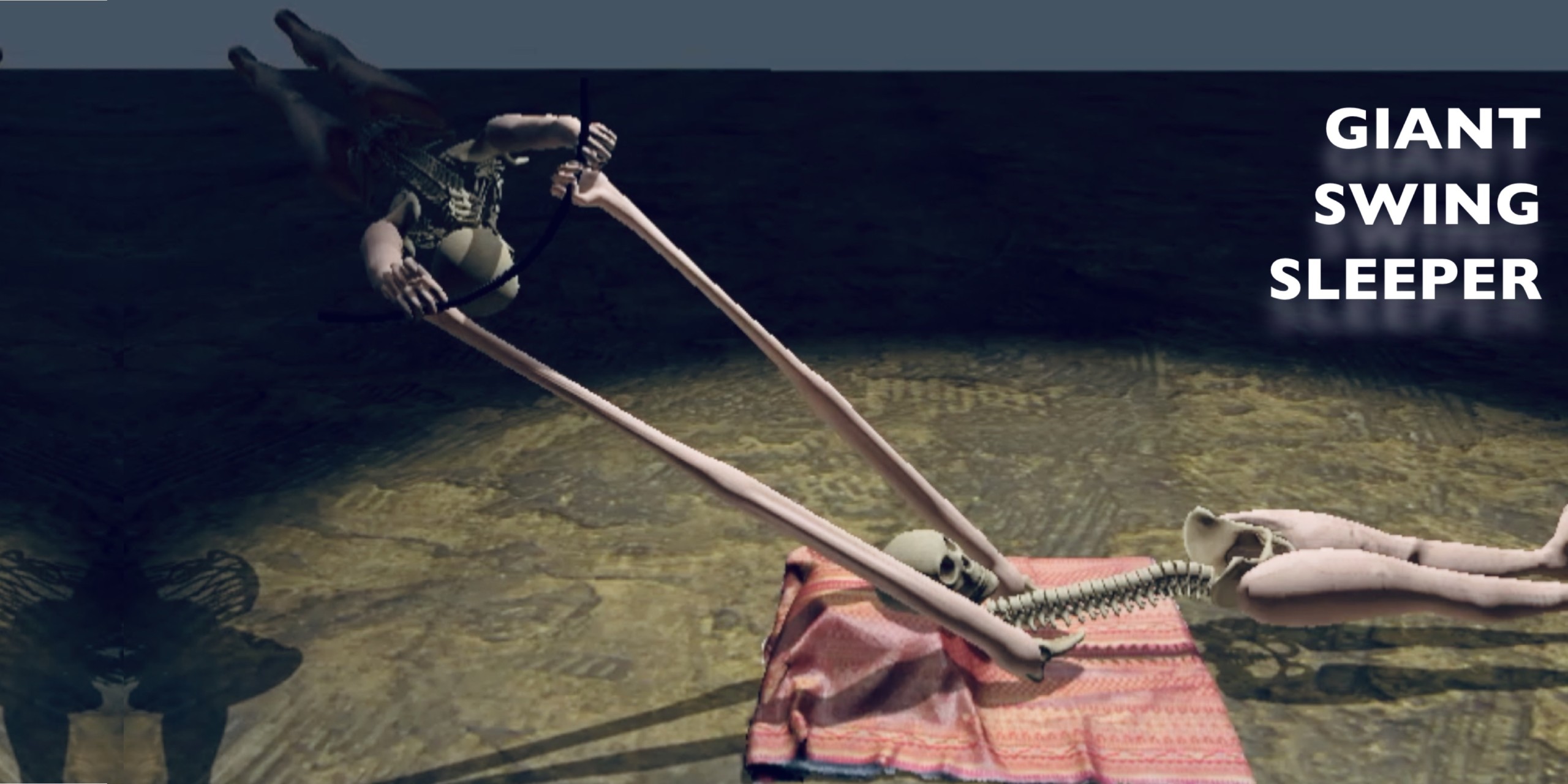 Giant swing sleeper is a head-mounted display (HMD) interaction system that provides a vivid illusory experience of doing a giant swing while lying down on the bed. This is accomplished by identifying the skeleton-avatar swinging on a handle in HMD space with oneself. The swing amplitude correlates how hard the experimenter pulls up the physical handle held by the participant lying down, that is directly related to the increment of the experimenter’s weight. Thus, the sense of being pulled up physically is transformed into an illusory giant swing in HMD space. This interaction creates an illusory sense of gravity as though looking down toward the ground from above as is typically reported in an out-of-body experience (gravity reversal). Many participants also feel that they pull up the handle upwards rather than they are pulled by the experimenter (passive-active reversal). The questionnaire in the exhibition revealed that many participants strongly experienced two kinds of reversal.