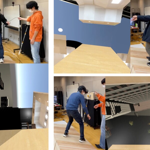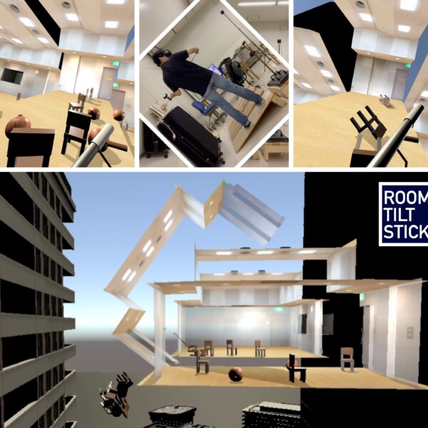 Room Tilt Stickは、極めて稀な錯視症例(ルームチルト錯覚)を参考として、周囲から切り出された自分自身の近傍空間が左右に回転し、重力方向が90度ズレた一人称視点を体験することのできるHMDによるシステムである。具体的には、体験者が壁に向かって傾いた足場の上で壁をスティックで押し込むと、その負荷に応じてVR空間の部屋も回転し90度傾いたところで回転が停止する。これにより、自分で部屋を押して回転させている感覚と、一人称視点に走る重力の向きが変化している感覚が得られるものである。さらに、HMD内で90度回転された部屋の足場を見ながら、現実空間において傾斜角度が徐々に強くなる足場を歩くことで、現実の足場の不安定性が増幅され、実際よりも極めて急峻な斜面の上を歩いている感覚が得られる。
