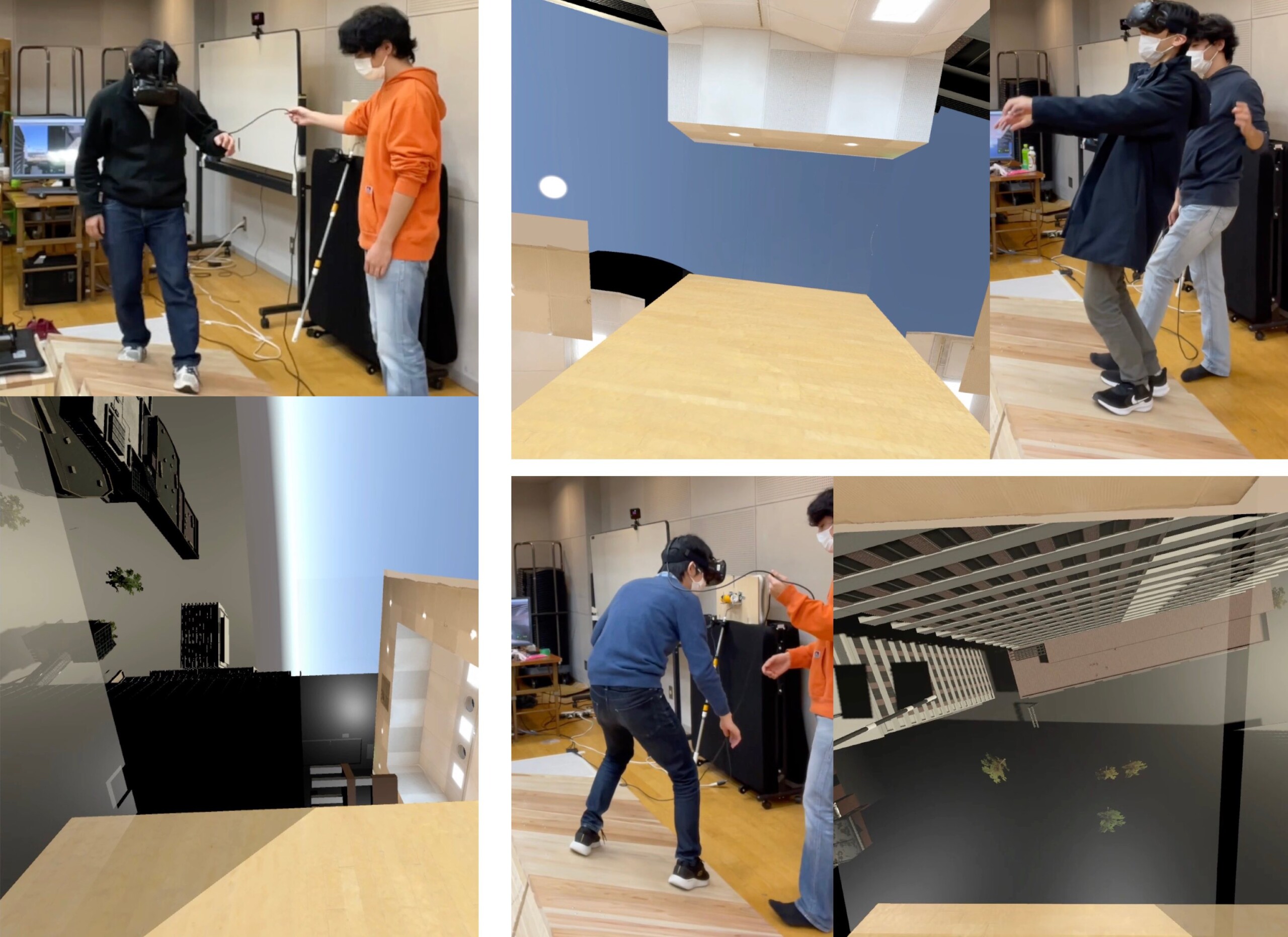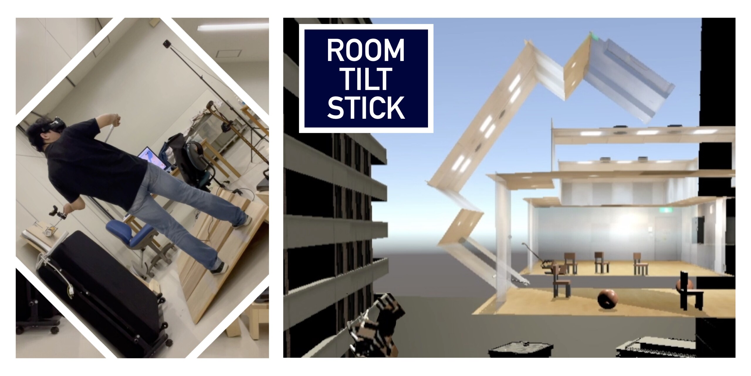 Room Tilt Stickは、極めて稀な錯視症例(ルームチルト錯覚)を参考として、周囲から切り出された自分自身の近傍空間が左右に回転し、重力方向が90度ズレた一人称視点を体験することのできるHMDによるシステムである。具体的には、体験者が壁に向かって傾いた足場の上で壁をスティックで押し込むと、その負荷に応じてVR空間の部屋も回転し90度傾いたところで回転が停止する。これにより、自分で部屋を押して回転させている感覚と、一人称視点に走る重力の向きが変化している感覚が得られるものである。さらに、HMD内で90度回転された部屋の足場を見ながら、現実空間において傾斜角度が徐々に強くなる足場を歩くことで、現実の足場の不安定性が増幅され、実際よりも極めて急峻な斜面の上を歩いている感覚が得られる。