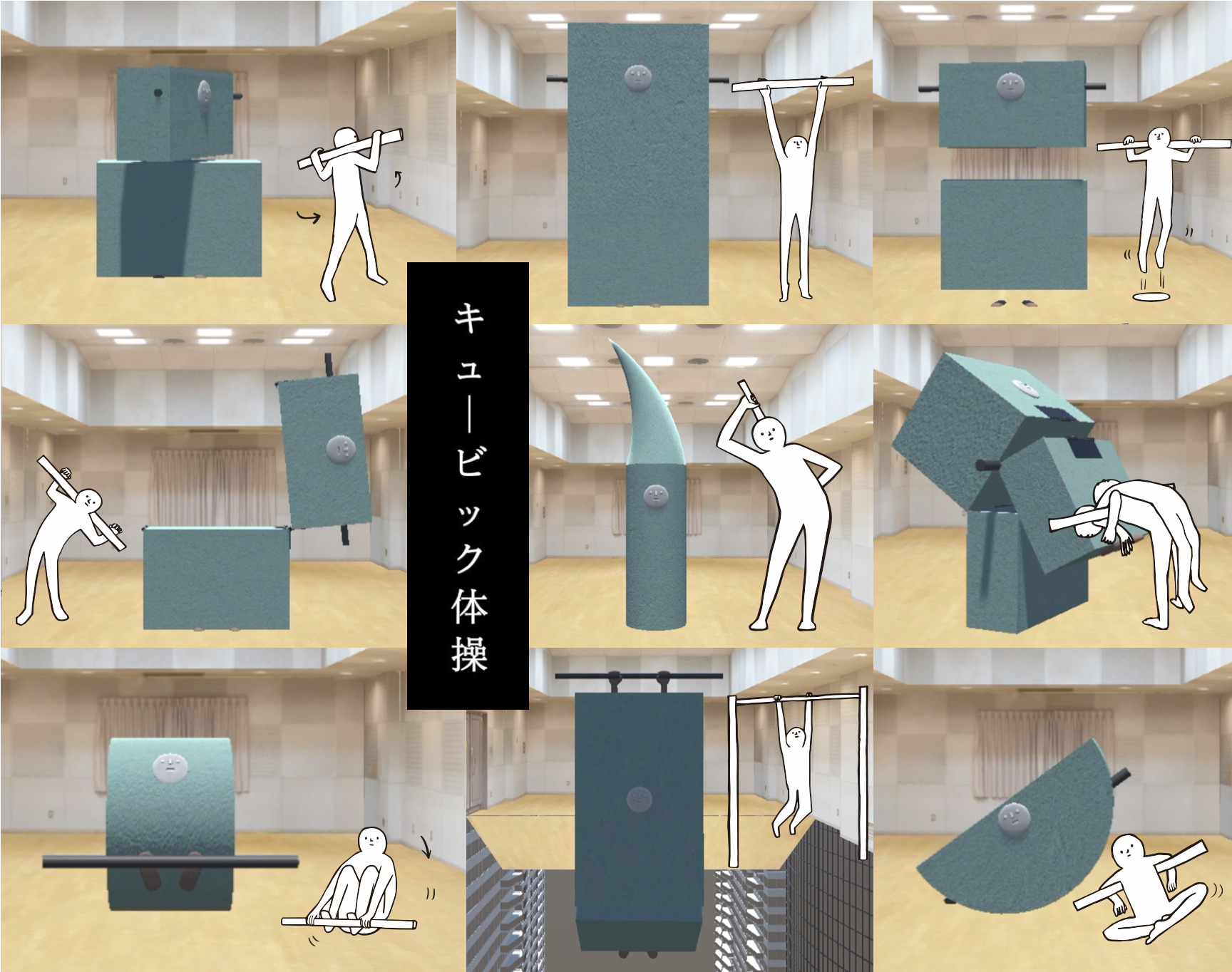 いよいよ来週から展示です!!今日から毎日 #人体の幾何学的転回予告 やります。まずは「キュービック体操第1:分離と吸着」及び「第2:超分離」の映像から。身体をCubeとして扱うことで、上半身的自己と下半身自己との間に無自覚に存在していた心理的接着の<剥がれ>を体感できるようになります。 pic.twitter.com/BJJCmrm3uN