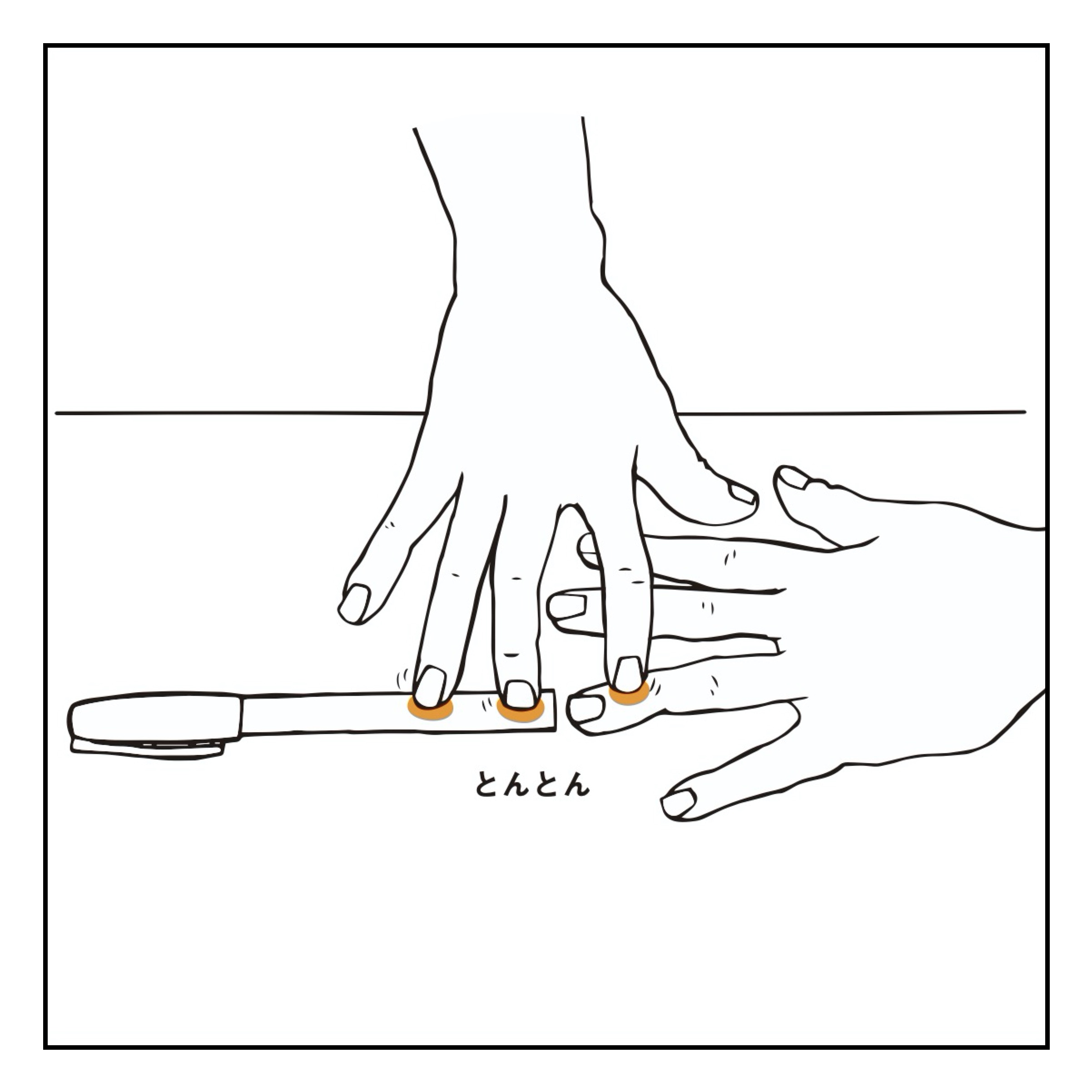 - 右手の人差し指を、左手の薬指の爪のすぐ内側に、右手の中指と薬指をペンの表面に添え、目を閉じた状態で、三点の同じ場所を同時にとんとんする。