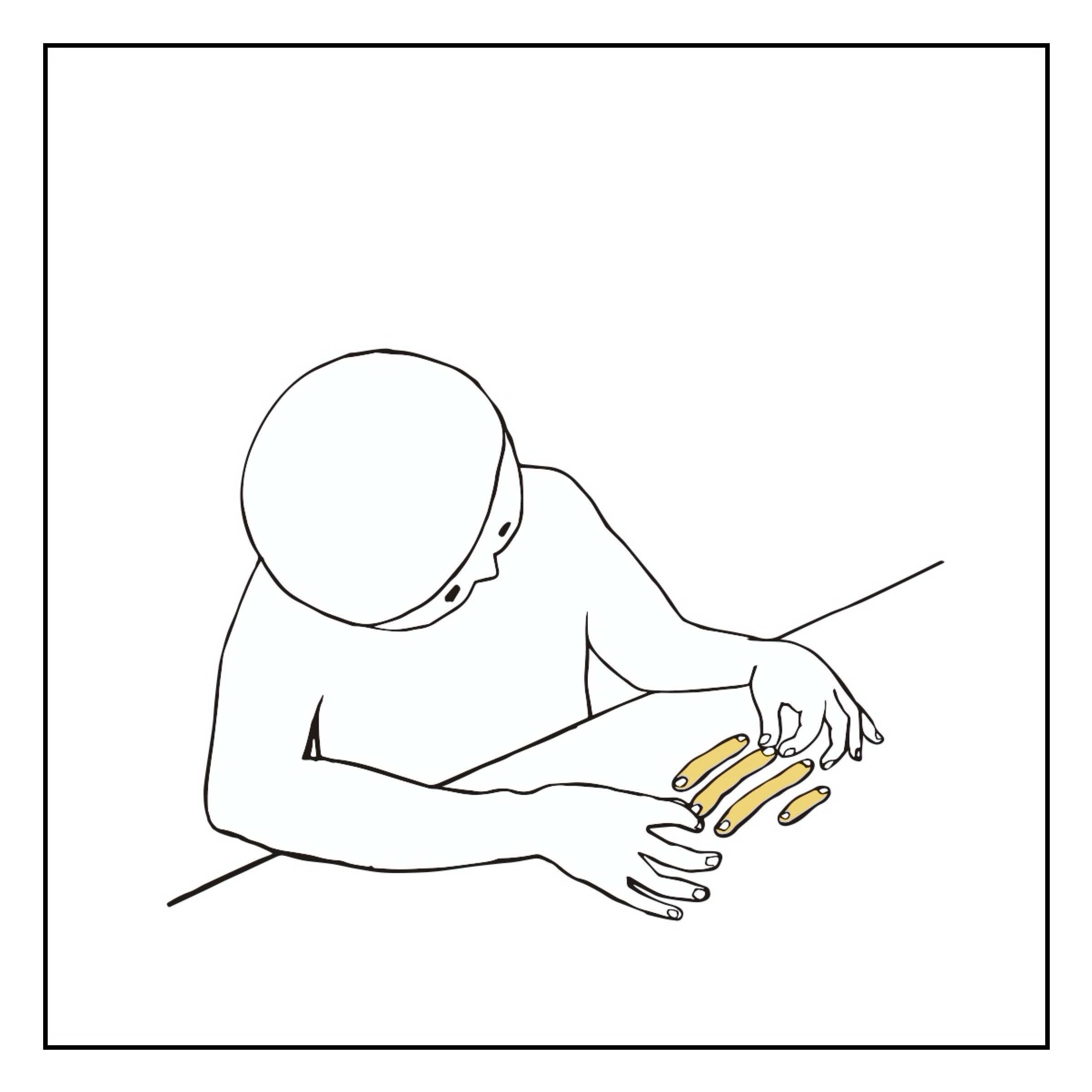 - 鏡の裏側から、鏡に隠れた左手の指を隙間を通して手前側にスライドさせ、鏡像を見ながら、露出した左手の指のそれぞれを右手で触る(逆も可)。