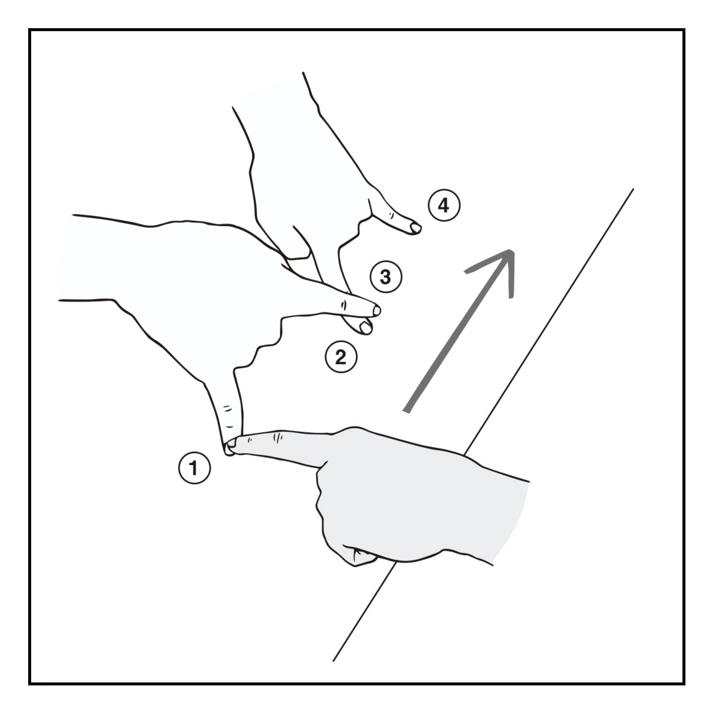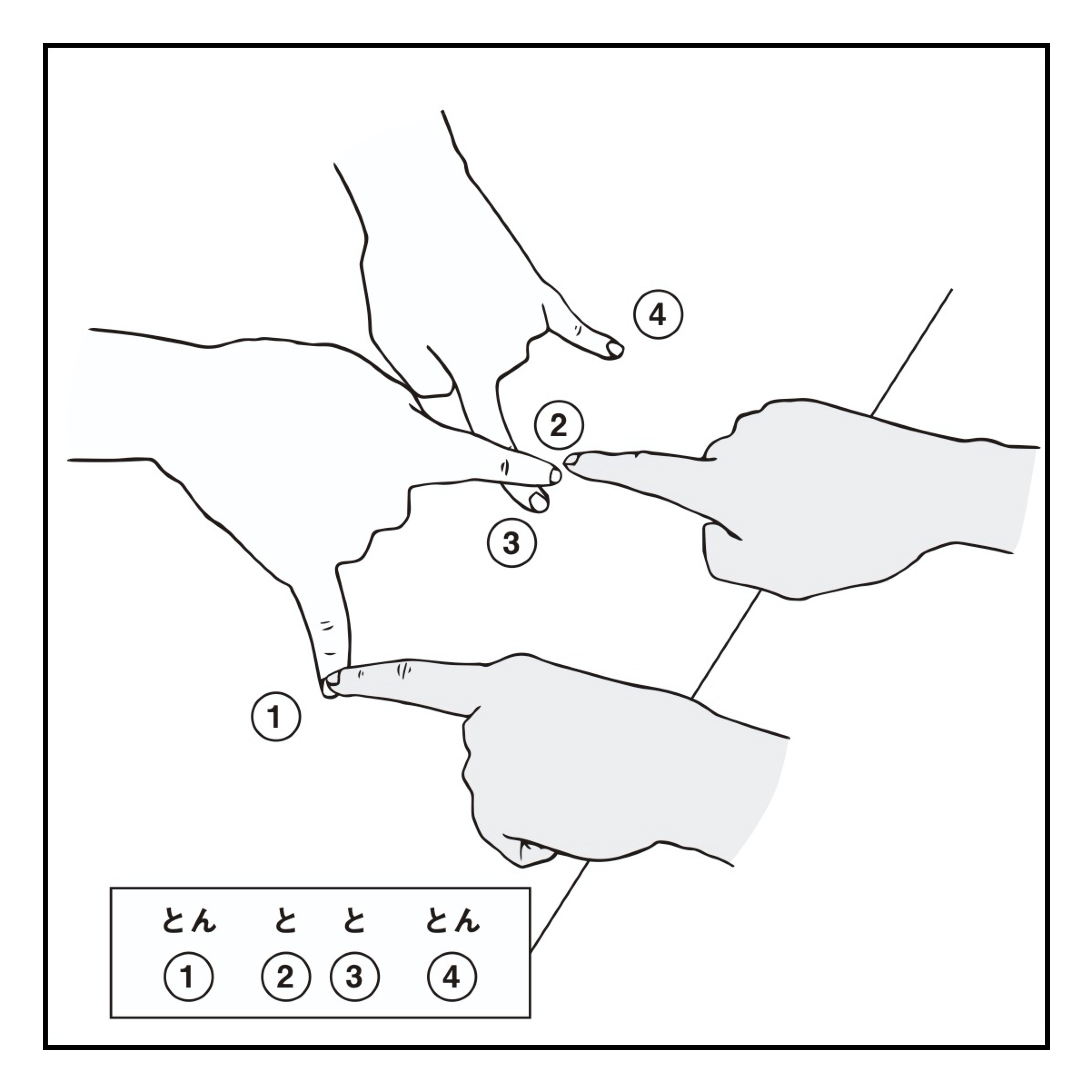 - 甲は、目を閉じた乙の四本の指を「とんとととん」のリズムで連打する。このとき、順序は左小指→左人差し指→右人差し指→右小指またはその逆とする。